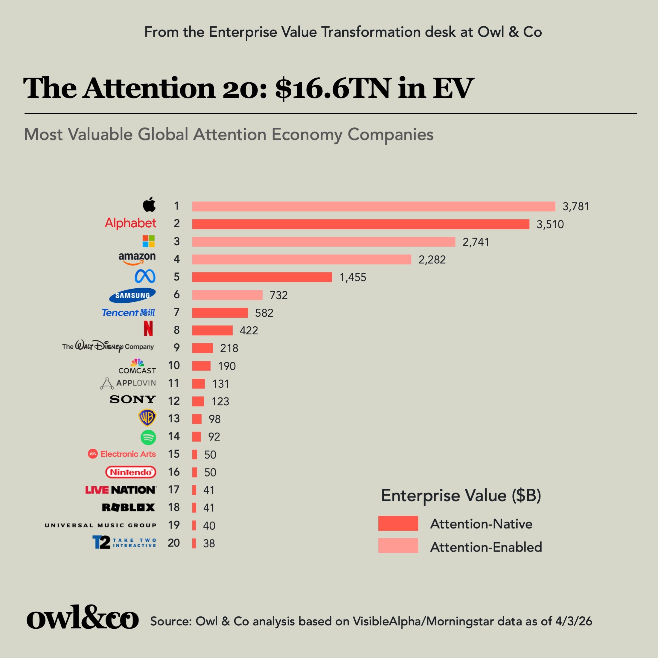 Questions answered: Which companies made Owl & Co’s Attention 20, the 20 top global attention economy companies ranked by enterprise value? What’s more closely correlated with EV/Sales: Growth or Margins? How can Netflix add billions of engagement hours without lifting a finger?